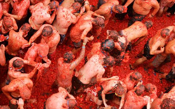 A Tomatina fesztivál története 1945-ből ered, amikor is fiatalok egy csoportja megzavart egy felvonulást, a kialakult káoszban pedig egy közeli zöldséges paradicsomaival kezdték dobálni egymást az emberek.