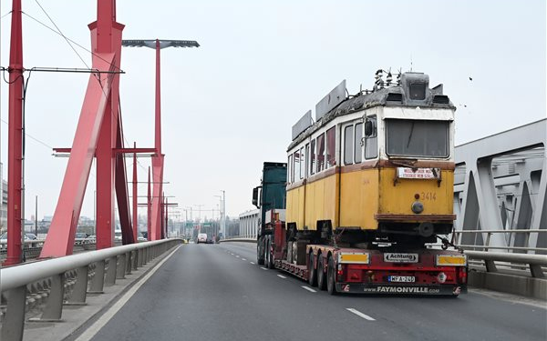 A Magyar Műszaki és Közlekedési Múzeum UV3 típusú villamos motorkocsiját viszik trélerrel a Rákóczi hídon 2022. november 22-én.