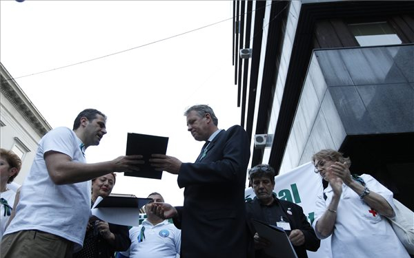 Petíciókat adtak át tüntető egészségügyi dolgozók Budapesten az egészségügyi államtitkárnak, amelyben egyebek mellett szakdolgozói életpályamodellt, béremelést és megfelelő finanszírozást követeltek.